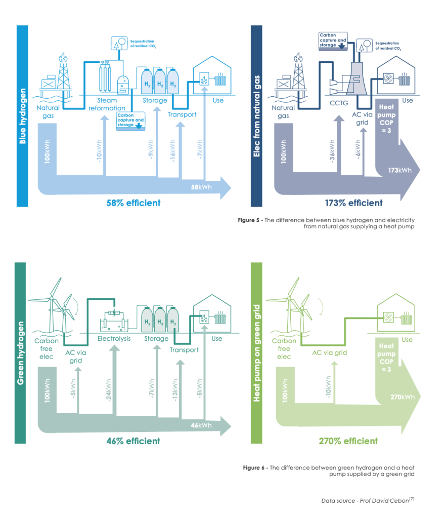 Figure from the above report. For ‘Green Hydrogen’ we would need a factor of 270%/46% more renewables generation to match the heat provided by heat pumps, that is, nearly 6 times as many off-shore wind turbines operating in winter when we need the heat, for example.