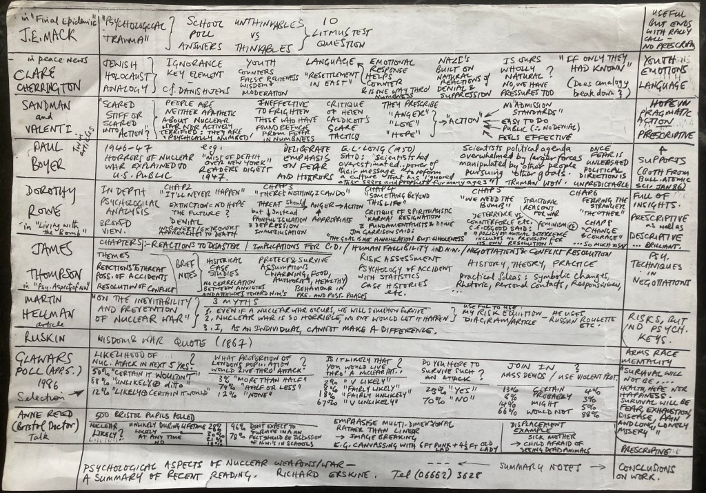 Another file on readings of psychological responses to the nuclear threat, which I summarised on a one pager. Some of the insights seem universal. Denial is a complex condition, and I always cringe when those in denial on climate change feel they are being linked to holocaust denial.