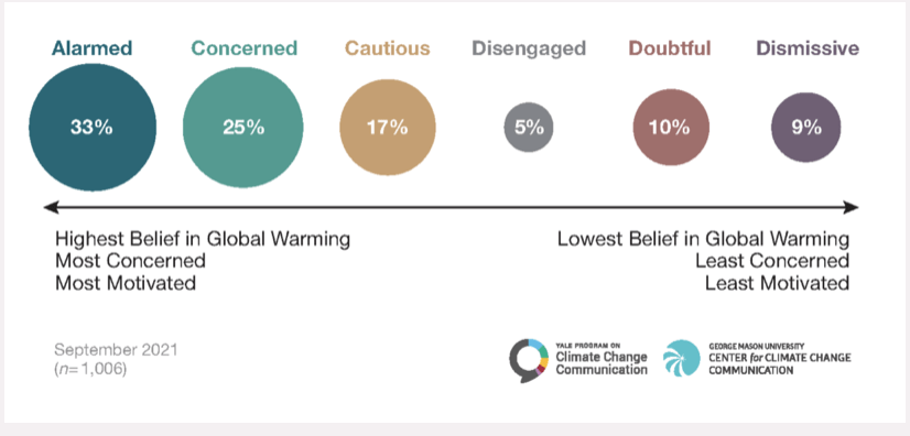 - Yale Climate Change Communications ‘6 Americas’, https://climatecommunication.yale.edu/publications/global-warmings-six-americas-september-2021/