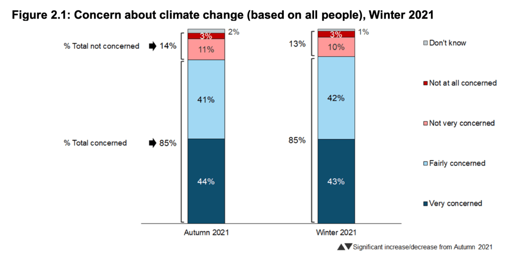 The UK Government’s Winter 2021 Attitudes Survey showed that 85% of respondents were either ‘very concerned’ or ‘fairly concerned’ about climate change [2].