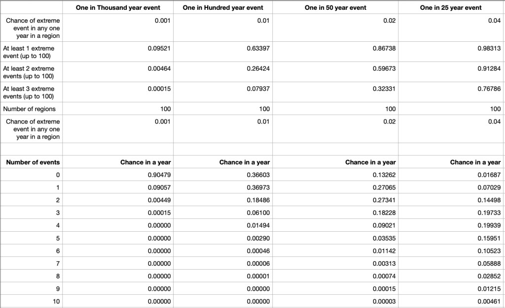 To explore the impact of global warming on the change odds, I have used a progression as follows. The average chance of an extreme weather event in any one year, in any one block, was 1 in 1000 but as the world warms it might become a 1 in 100 year event, or worse a 1 in 50 year event, or worse still a 1 in 25 year event. In Note [4] there are details on calculating the odds for up to 10 events per year across the 100 blocks.