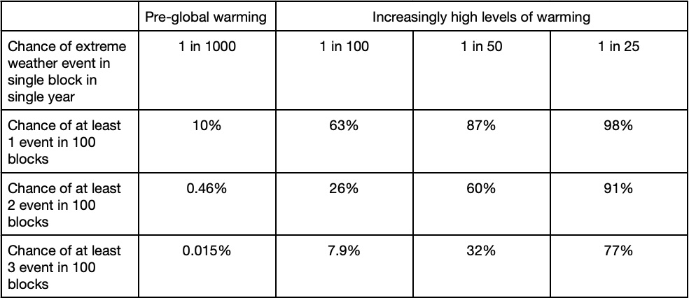 We have gone from a 1 in 1000 chance of an extreme event in one block in one year, to a 1 in 10 chance of at least one extreme weather event across the 100. A simpler way to see this is the 100 x (1/1000) = 1/10.