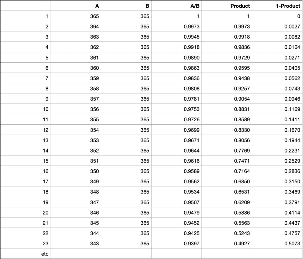 The Product is the calculated by multiplying the successive A/B values. So for 4 arrivals the Product = 1 x 0.9973 x 0.9945 x 0.9918 = 0.9836 is the probability that none have the same birthday. So the chance of at least two having the same birthday for 4 arrivals = 1 – 0.9836 = 0.0164