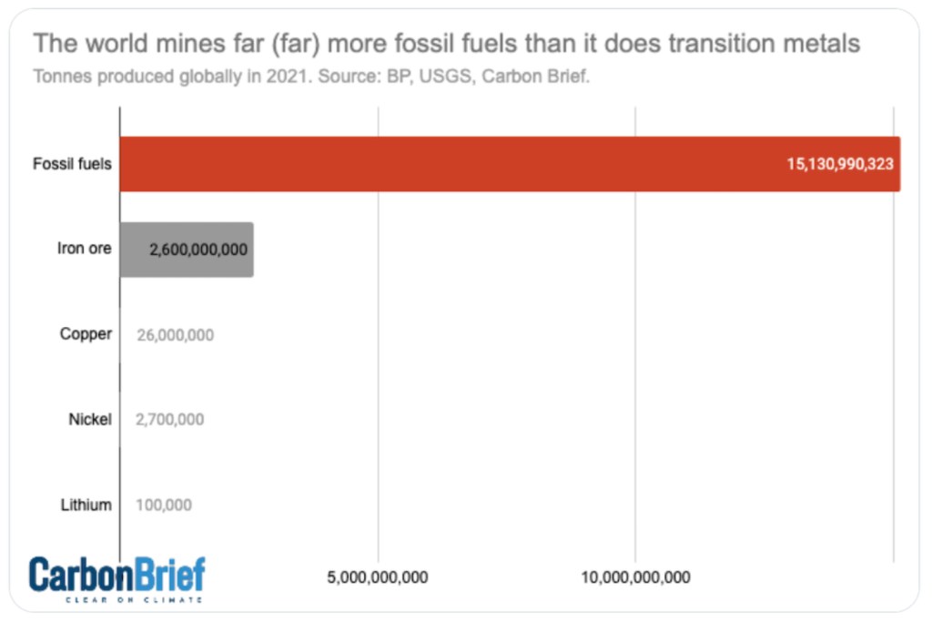This is another category error that unfortunately Fressoz seems happy to go along with. The quantities of minerals required is minuscule compared with the huge tonnage of fossil fuels that has powered our carbon economy, as CarbonBrief illustrated as follows, as part of a debunking of 21 myths about Electric Vehicles [6]: