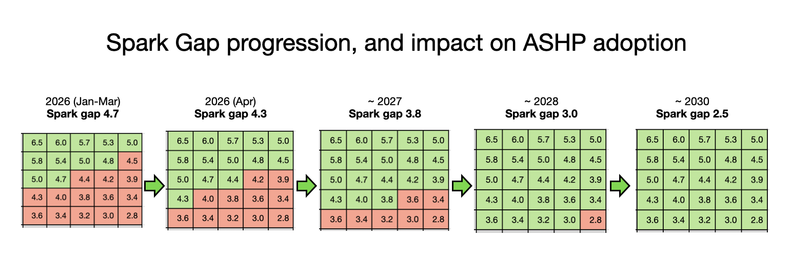 A figure of 2.5 will still be much more than several European countries, but given the efficiency of heat pumps, we do not need the spark gap to drop to the level of Sweden to achieve transformational change we need.