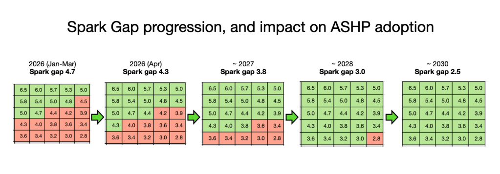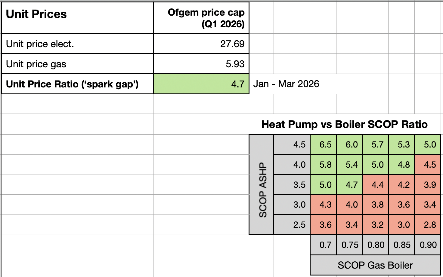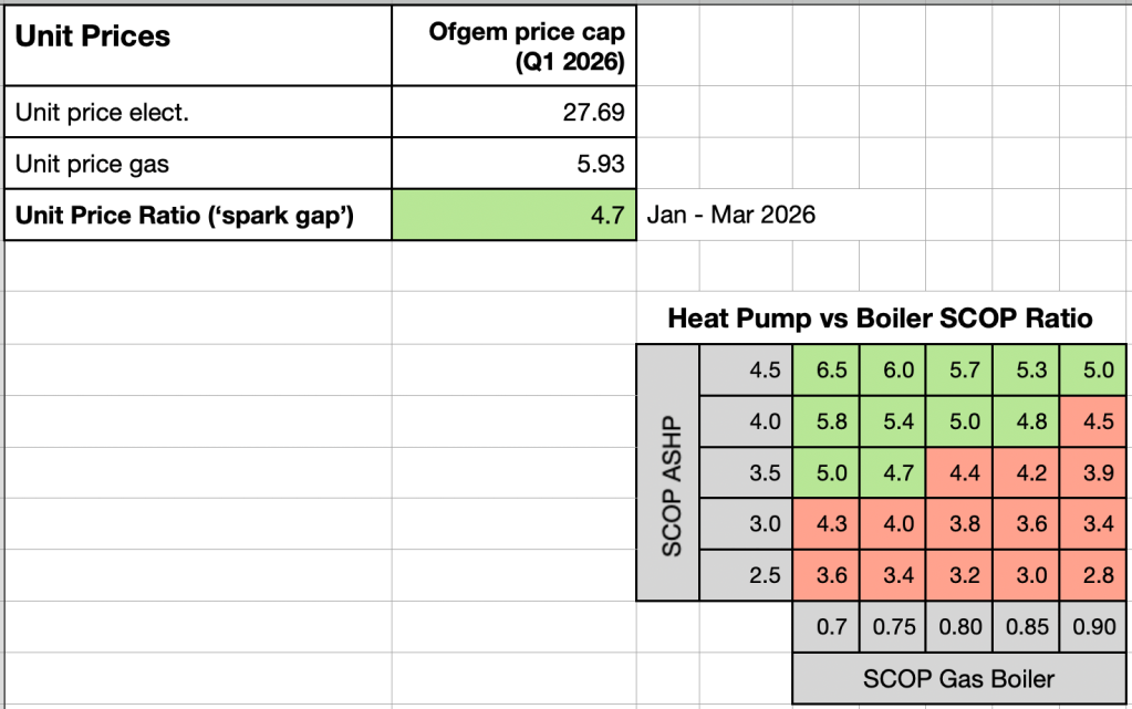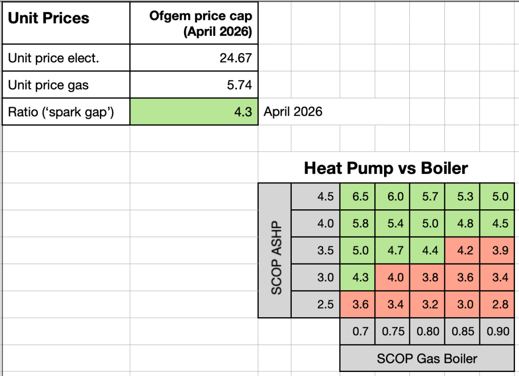 Let’s take the spark gap that existed in the first quarter of 2026. It was 4.7. Now depending on both the SCOP of the ASHP and the SCOP of the gas boiler, we’ll either pay the same or less (green coloured squares), or more (red colour sqaures):