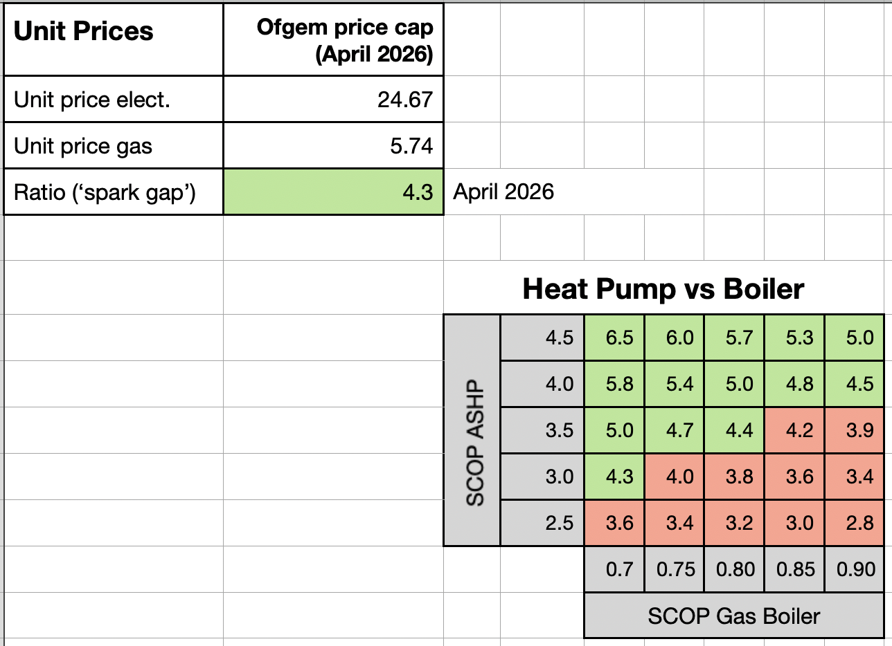 It shows that with this spark gap, moving from a 25 year old heat pump with a SCOP of 0.75, would require the ASHP to have a SCOP of at least 3.5. If it was a new boiler being switched out with a SCOP of 0.85 then the ASHP would then require a SCOP of 4, which is harder to reach but achievable.