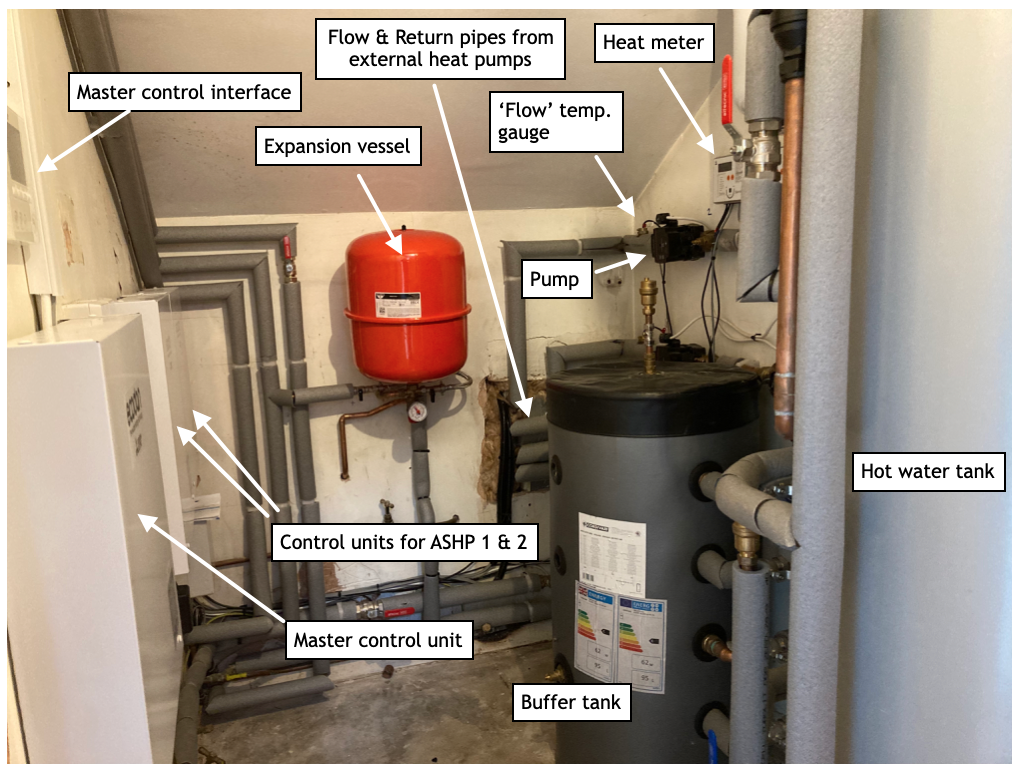 The heat meters get rate-of-flow data from the pumps and temperature data from gauges that were fitted to the ‘flow’ and ‘return’ pipes. The temperature drop between the warm flow and cooler return, multiplied by the flow rate, gives an instantaneous measurement of the heat being delivered to the house (e.g. to the radiators, but when in hot water heating mode, to the hot water tank).
