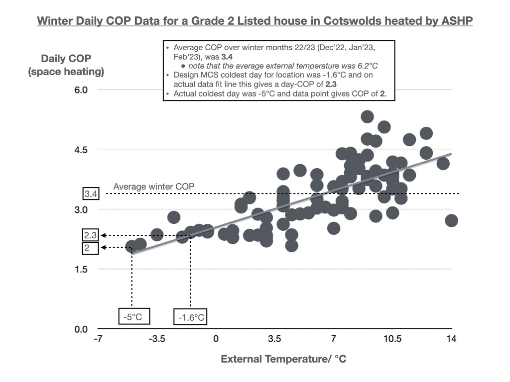 Design MCS coldest day for location was -1.6°C and on actual data fit line this gives a day-COP of 2.3