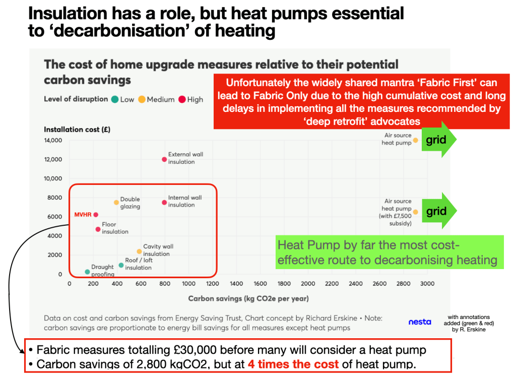 Insulation, replacing windows and other fabric measures are important but you can easily blow so much money on these that you leave nothing in the pot for a heat pump [6].